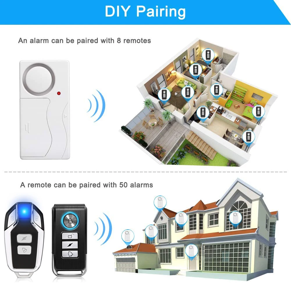 Elecpow Door Alarm Wireless Remote Control Anti-Theft Door And Window Security Alarms Sensor for Do-It-Yourself Home Security System. Many burglaries occur from break-ins through doors/ windows, especially side, rear and garage doors. This door security devices with 105 dB loud alarm sound can help to deter the intruder, wake or alert you if at home and possibly alert neighbors. The wireless door alarm have 4 modes--- Arm/Disarm/Panic/Doorbell mode controlled by the remote, wireless control range up to 49 ft. Not only a DIY door and window alarm, but also a door open chime/ pool alarm for kids safety or helps notify you if kids/ pets or visitors coming/ going, and emergency alert system for the older/ patients.